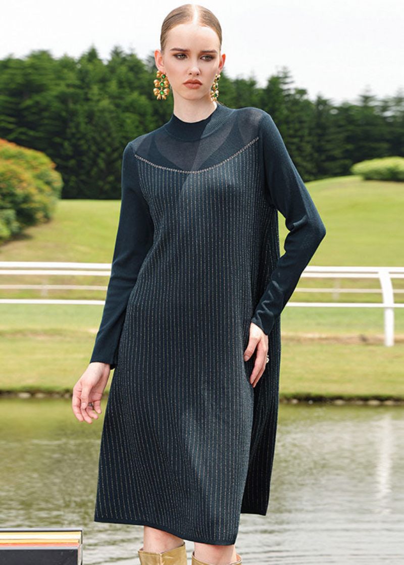 Fransk Grön Stativ Krage Patchwork Ull Stickad Lång Tröja Långärmad