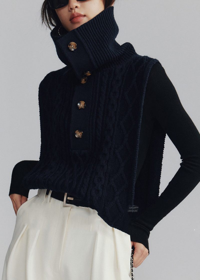 Fransk Mörkgrå Turtleneck-kabelstickad Väst Ärmlös