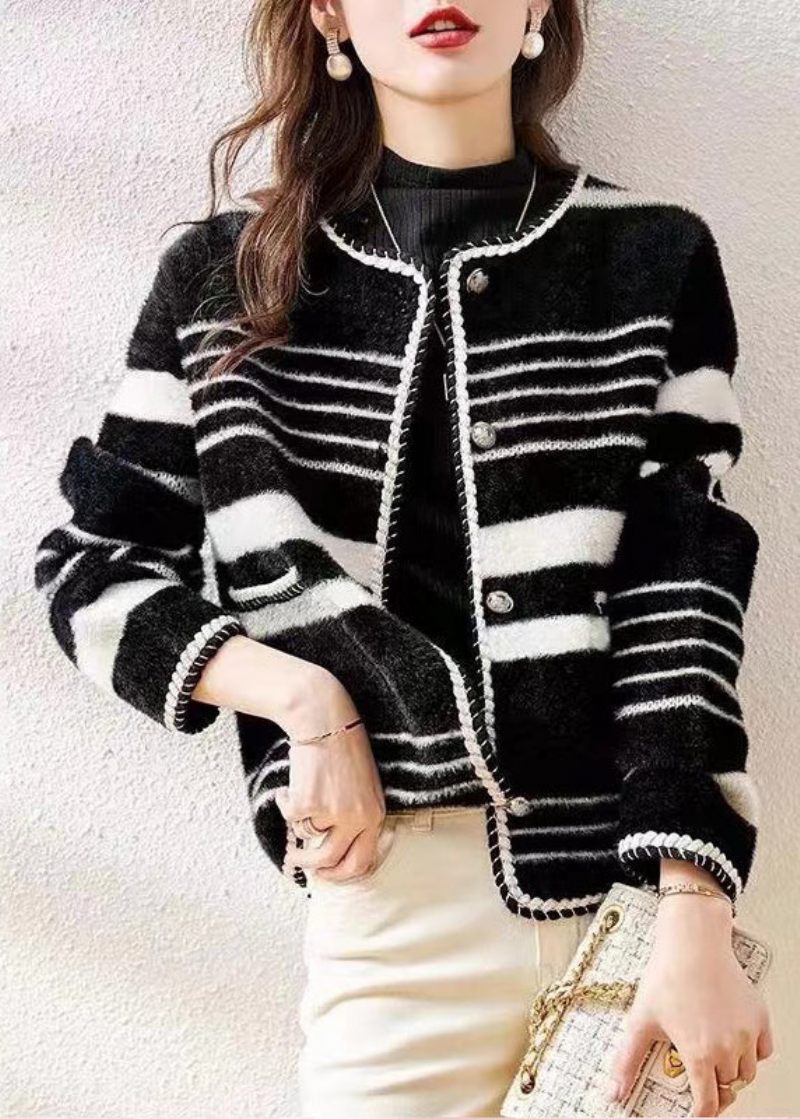 Fransk Svart O-hals Randig Kvinnor Mink Hår Stickad Kappa Höst