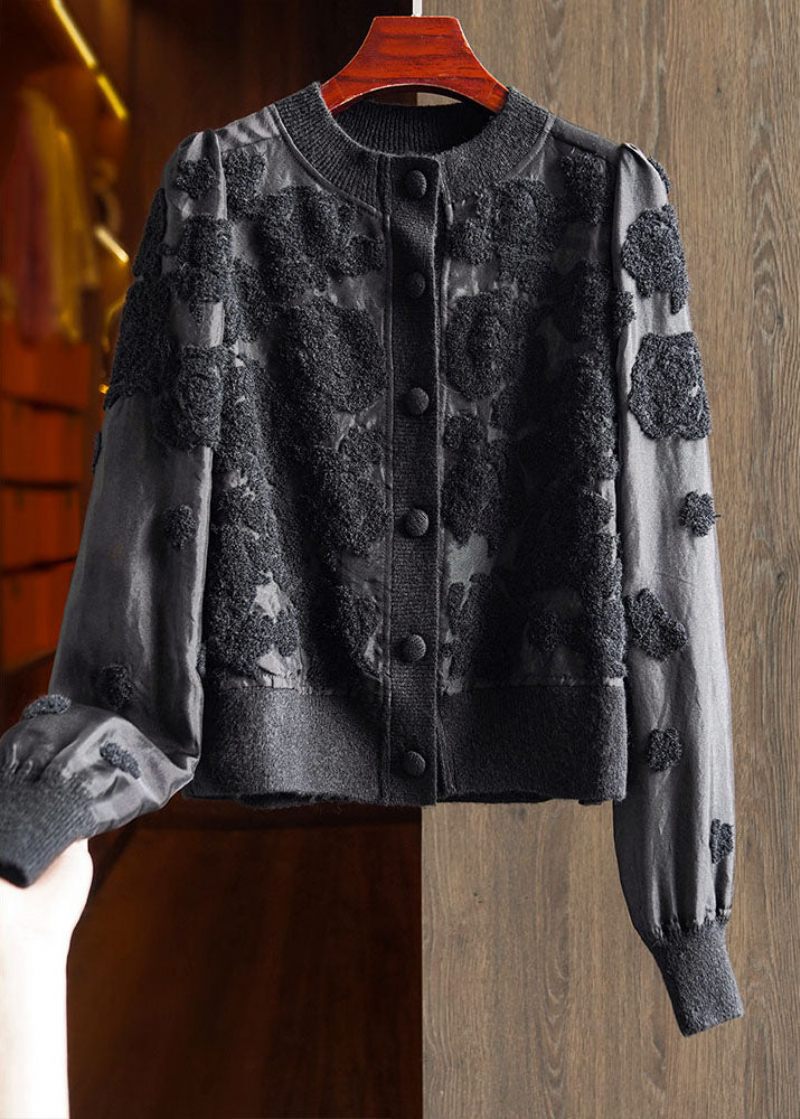 Fransk Svart O-ringad Knapp Silk Wool Patchwork Knit Coat Långärmad