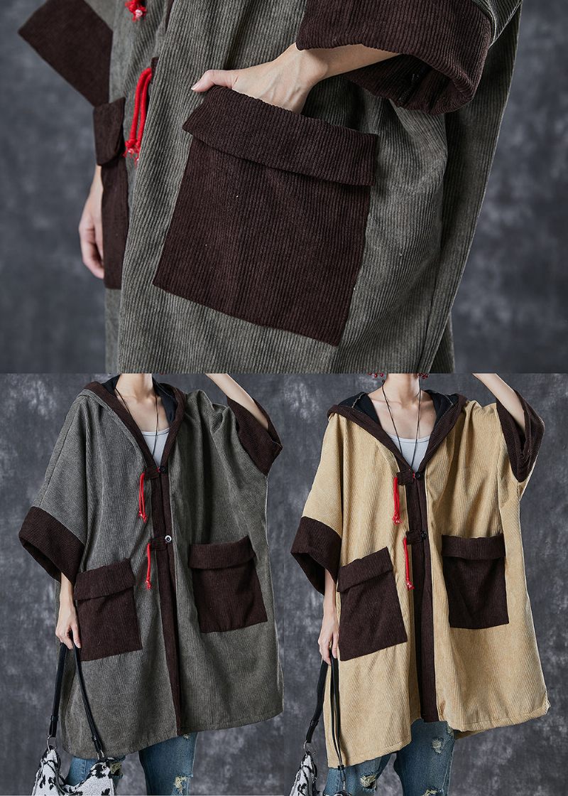 Franska Khaki Hooded Pockets Patchwork Varm Fleece Trench Spring