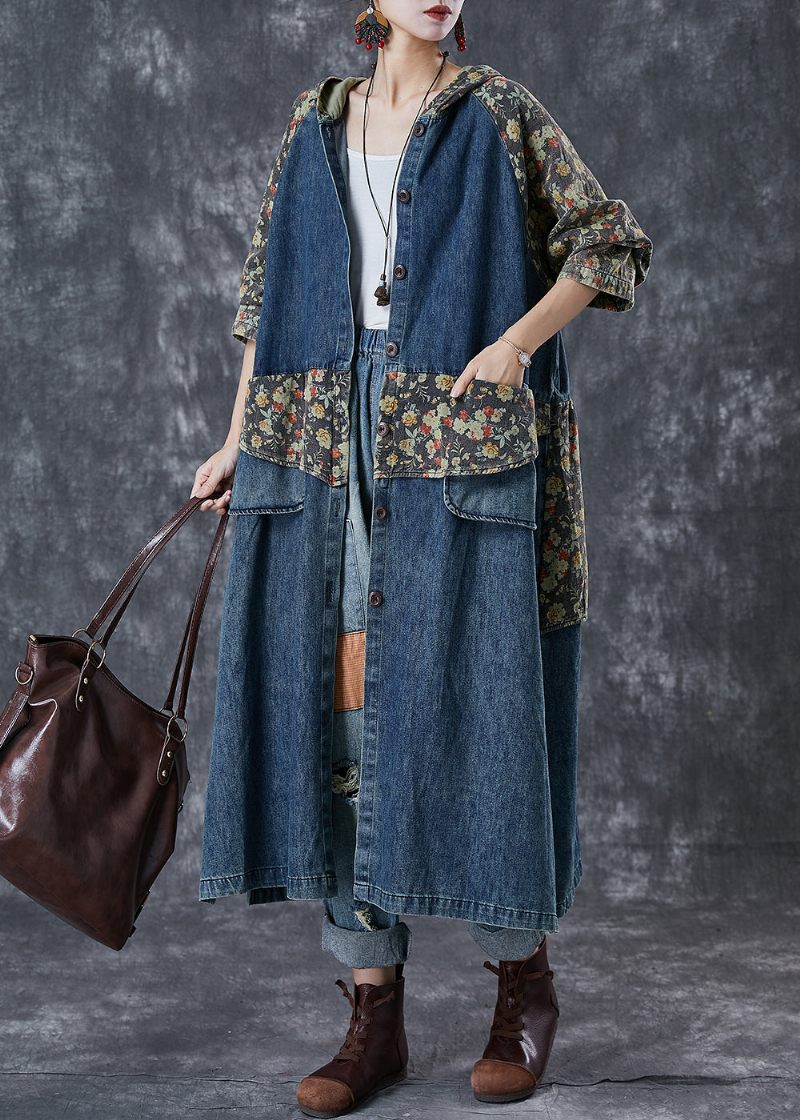 Franska Marinblå Oversized Patchwork Print Denim Trench Coats Hösten