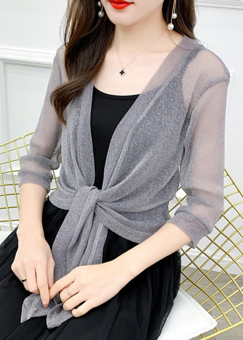 Grå Spetsad Tyll Cardigan V-hals Halvärm