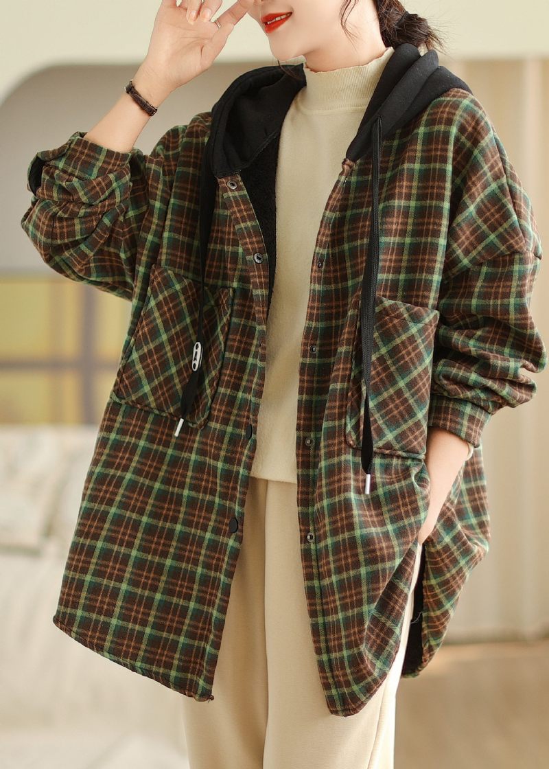 Gröna Fickor Pläd Lös Varm Fleecejacka Hooded Winter