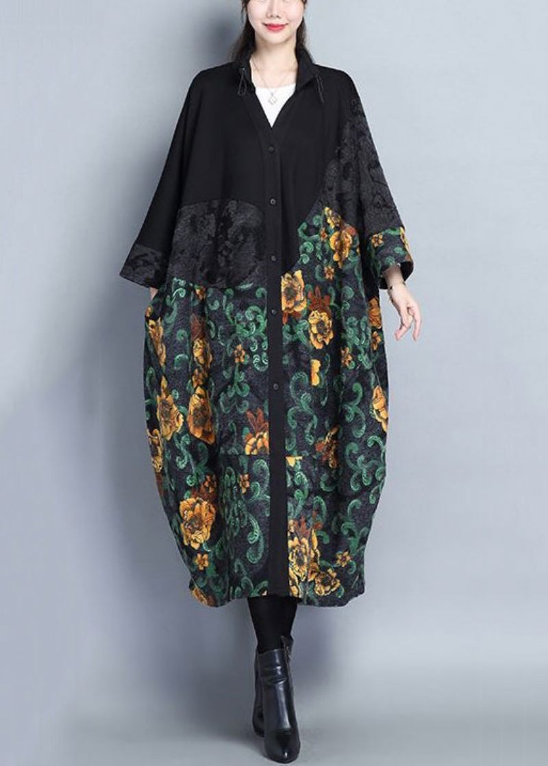 Grönt Tryck Fickor Patchwork Bomull Långa Trenchcoats Knapp Långärmad