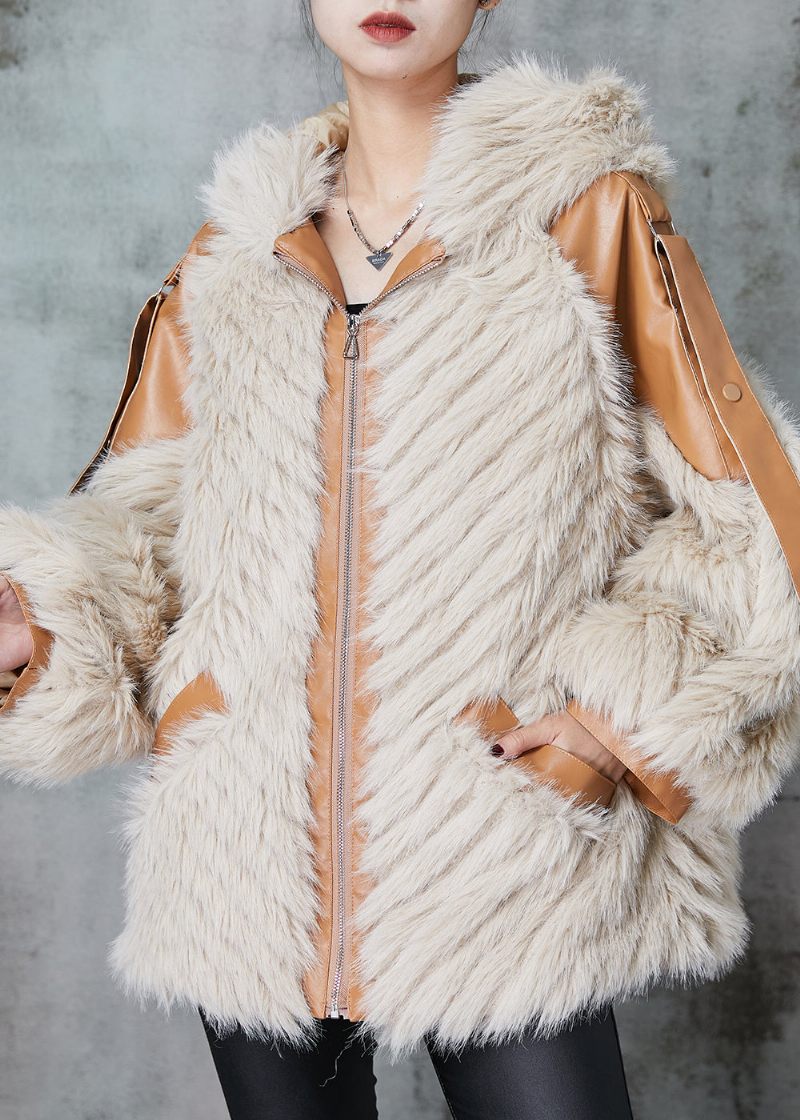Handgjord Aprikos Huva Patchwork Konstläder Och Pälsjacka Vinter