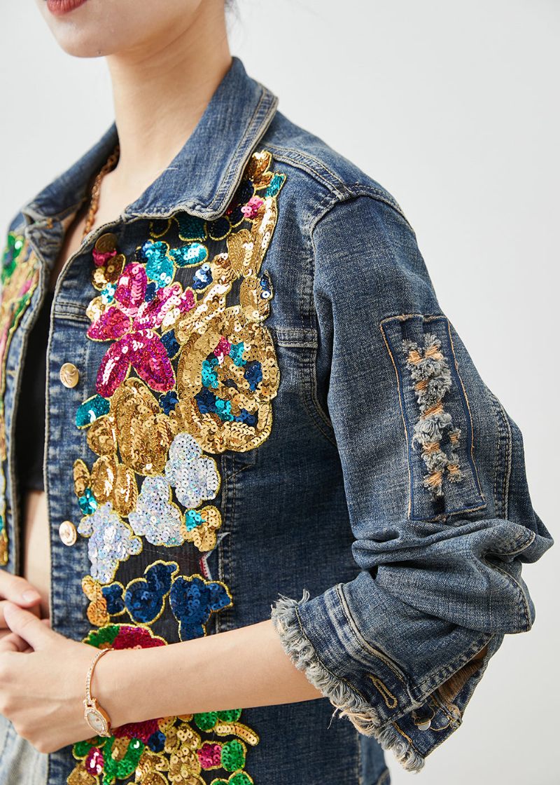 Handgjorda Marinblå Paljetter Denim Ripped Coats Fall