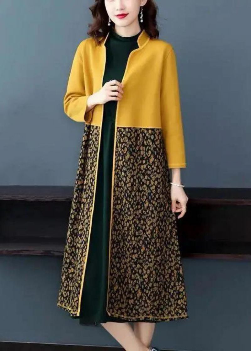 Italiensk Gul Stativ Krage Print Patchwork Bomull Trench Fall