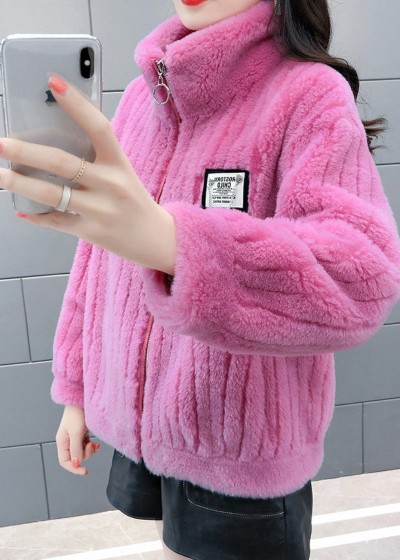 Italiensk Ros Stativ Krage Dragkedja Fuskpälsrockar Vinter