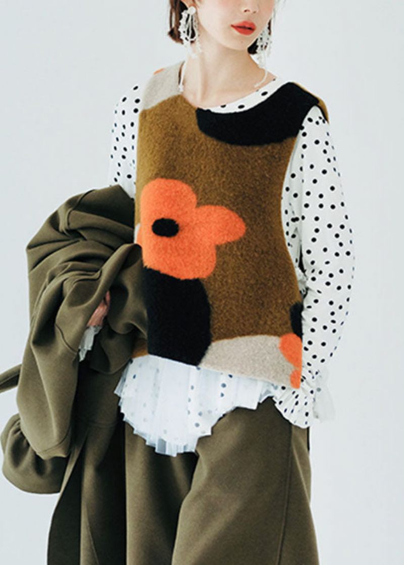 Jacquard Brun O-ringad Blommig Ylleväst Ärmlös