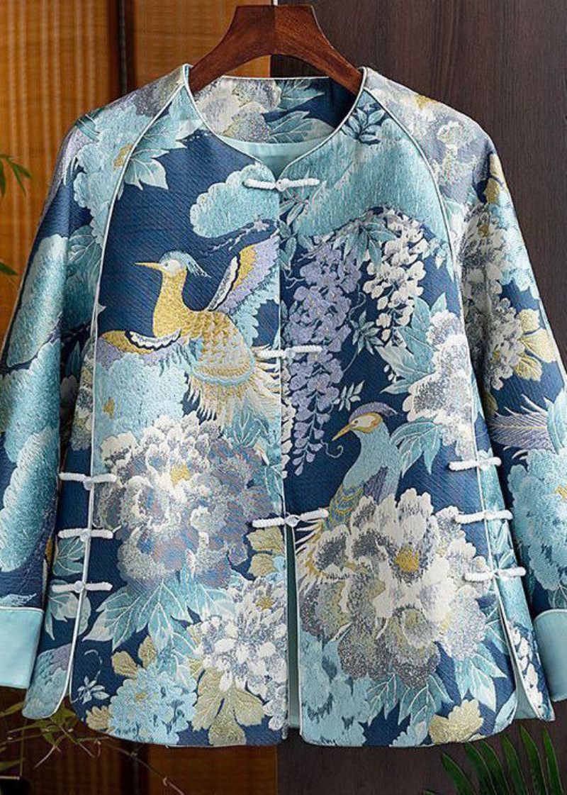 Kinesisk Stil Blå Broderad Orientalisk Knapp Skarvad Sidenkappa Höst