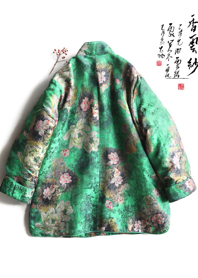Kinesisk Stil Grönt Tryck Knapp Fin Bomullsfylld Pufferjacka Vinter