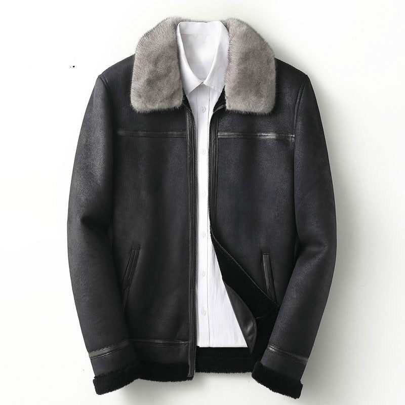 Kläder I Äkta Läder Shearling Jacka Herr Minkkrage