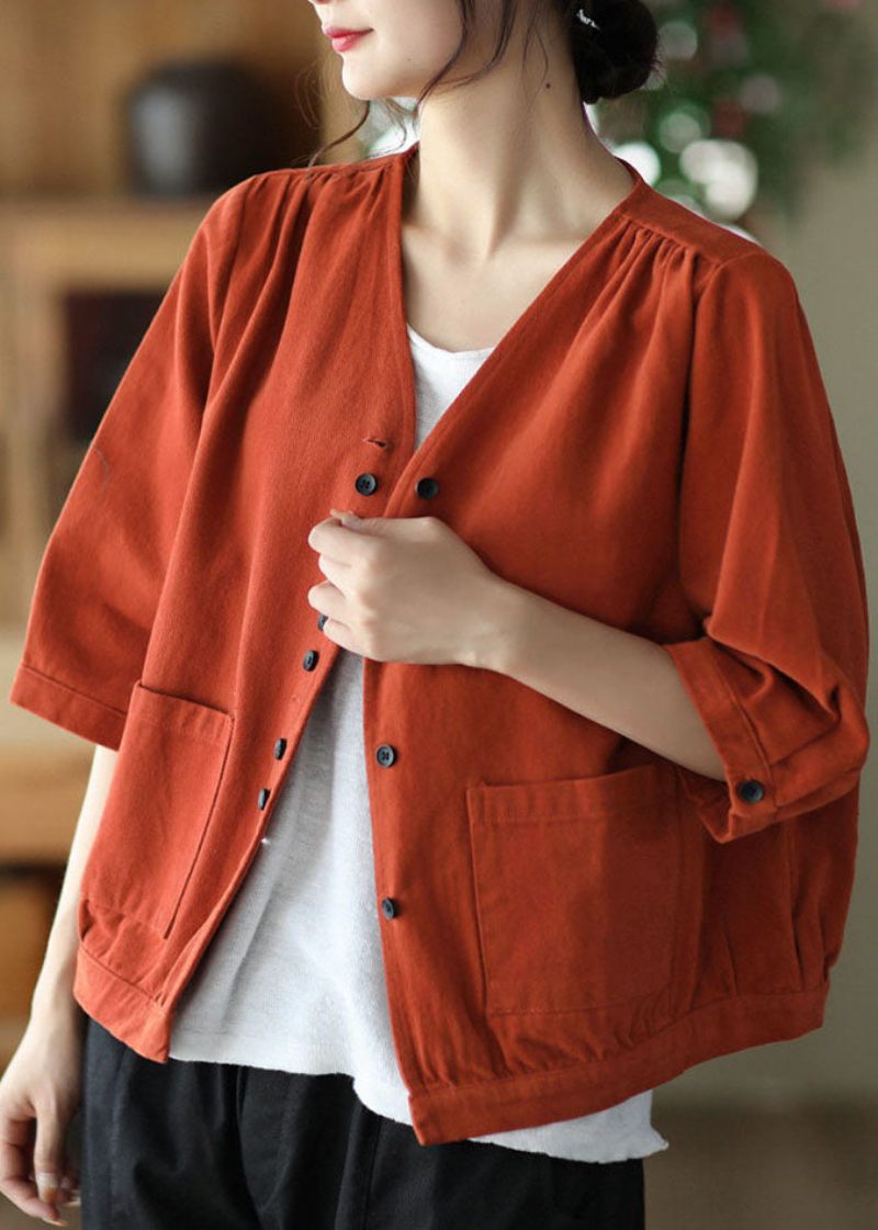 Konst Röd V-ringad Knappfickor Enfärgad Bomullsrock Armbandsärm
