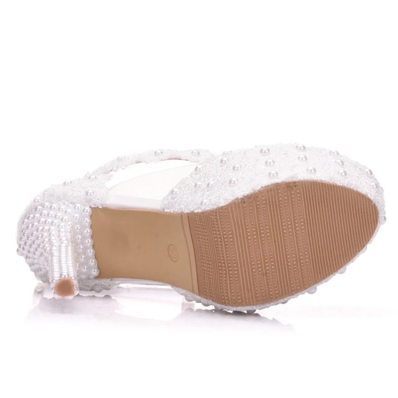 Kristalldrottning Vit Spets Blomma Brud 14cm Höga Klackar Rund Toe Bröllopspumpar Ankelband Dam Sandaler Brudtärna Skor