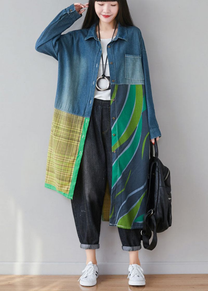 Kvinnor Blå Asymmetrisk Patchwork Print Bomull Denim Trench Coats Spring