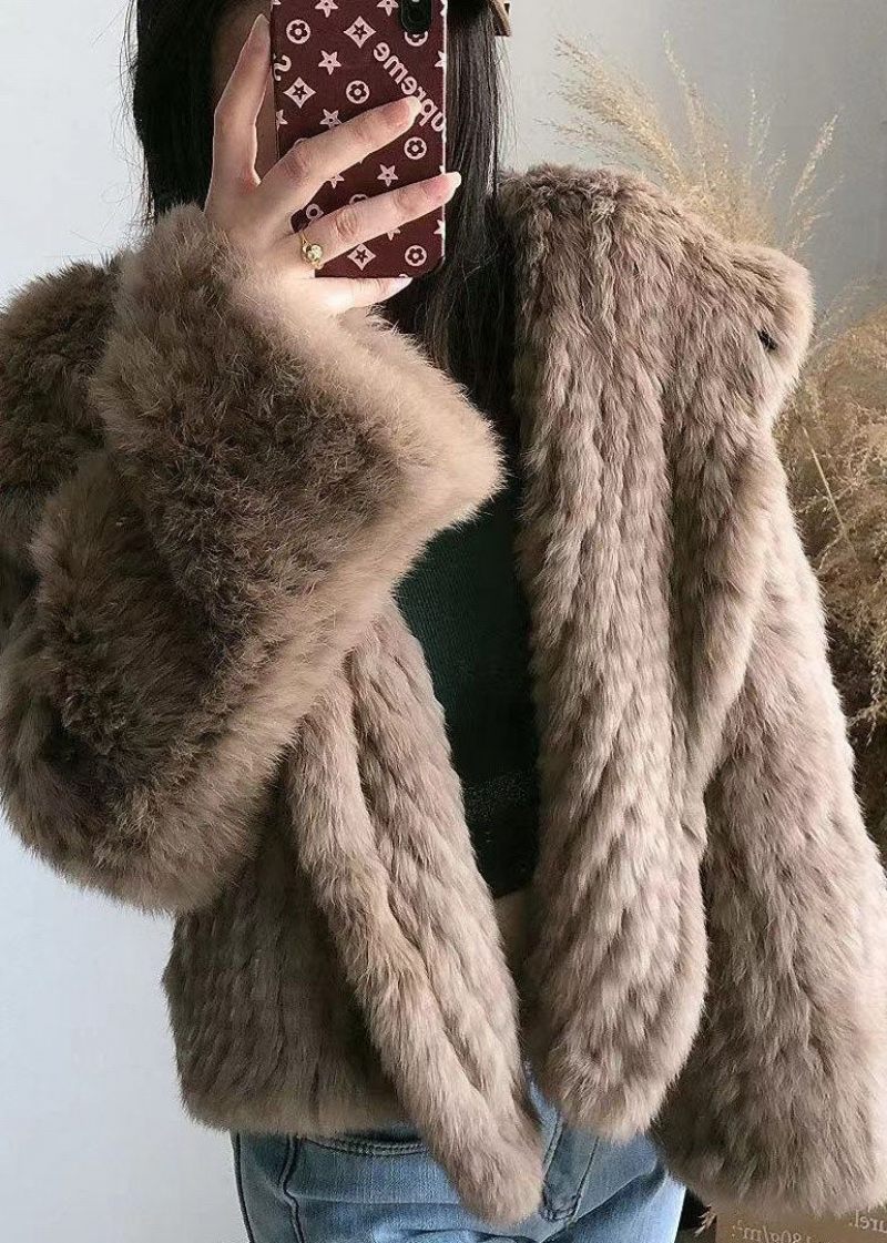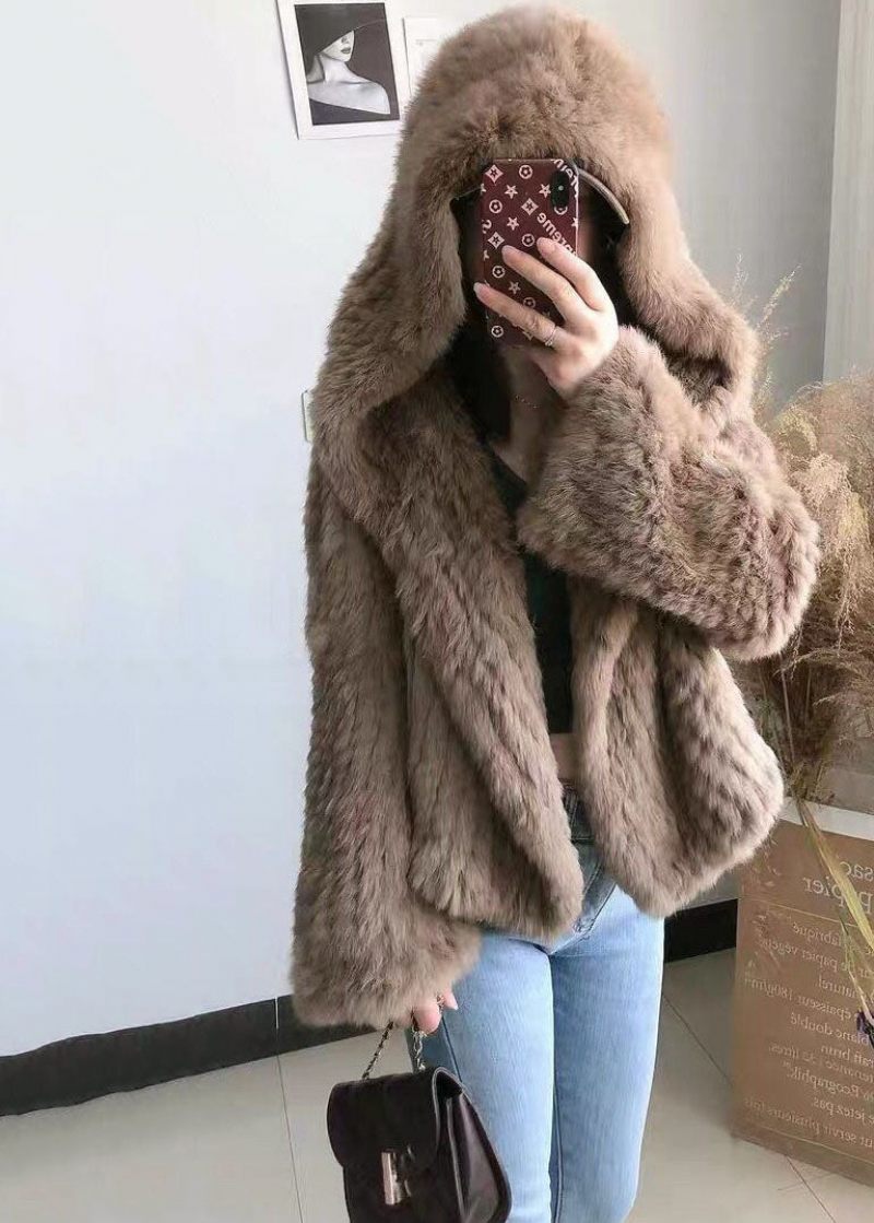 Kvinnor Choklad Hooded Enfärgad Kanin Hår Stickad Jacka Vinter