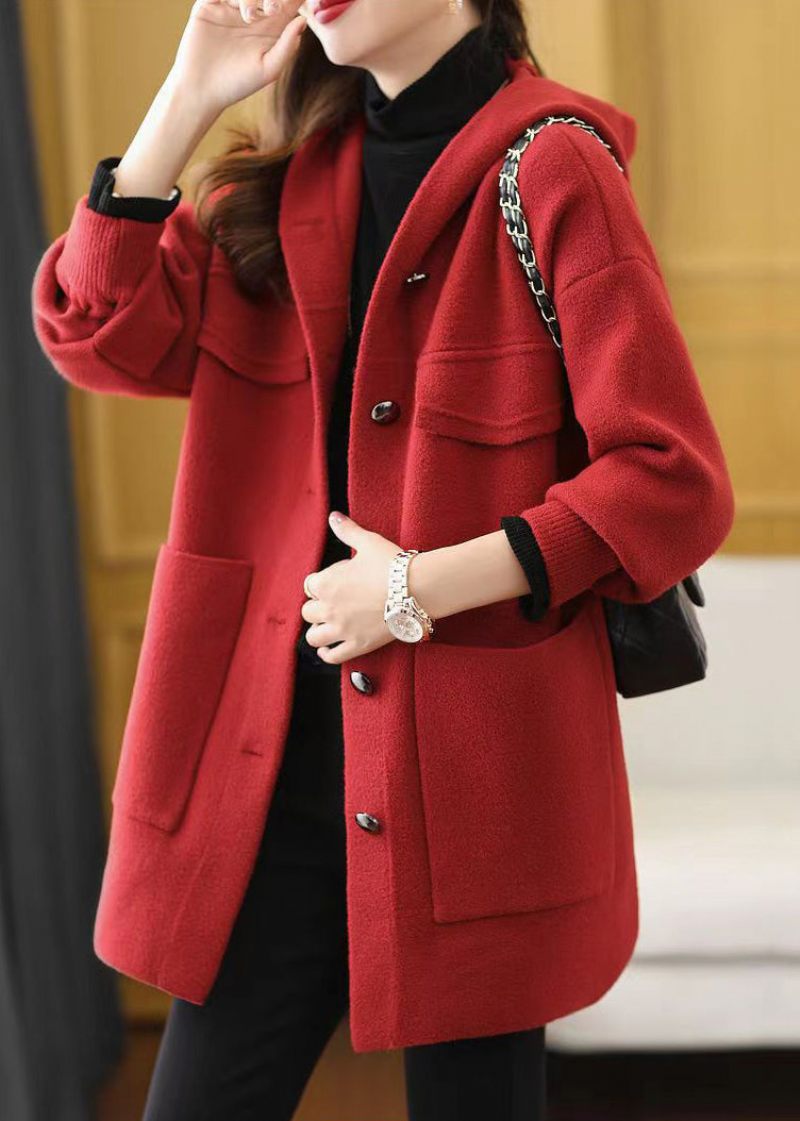 Kvinnor Röda Hooded Fickor Patchwork Woolen Coat Fall