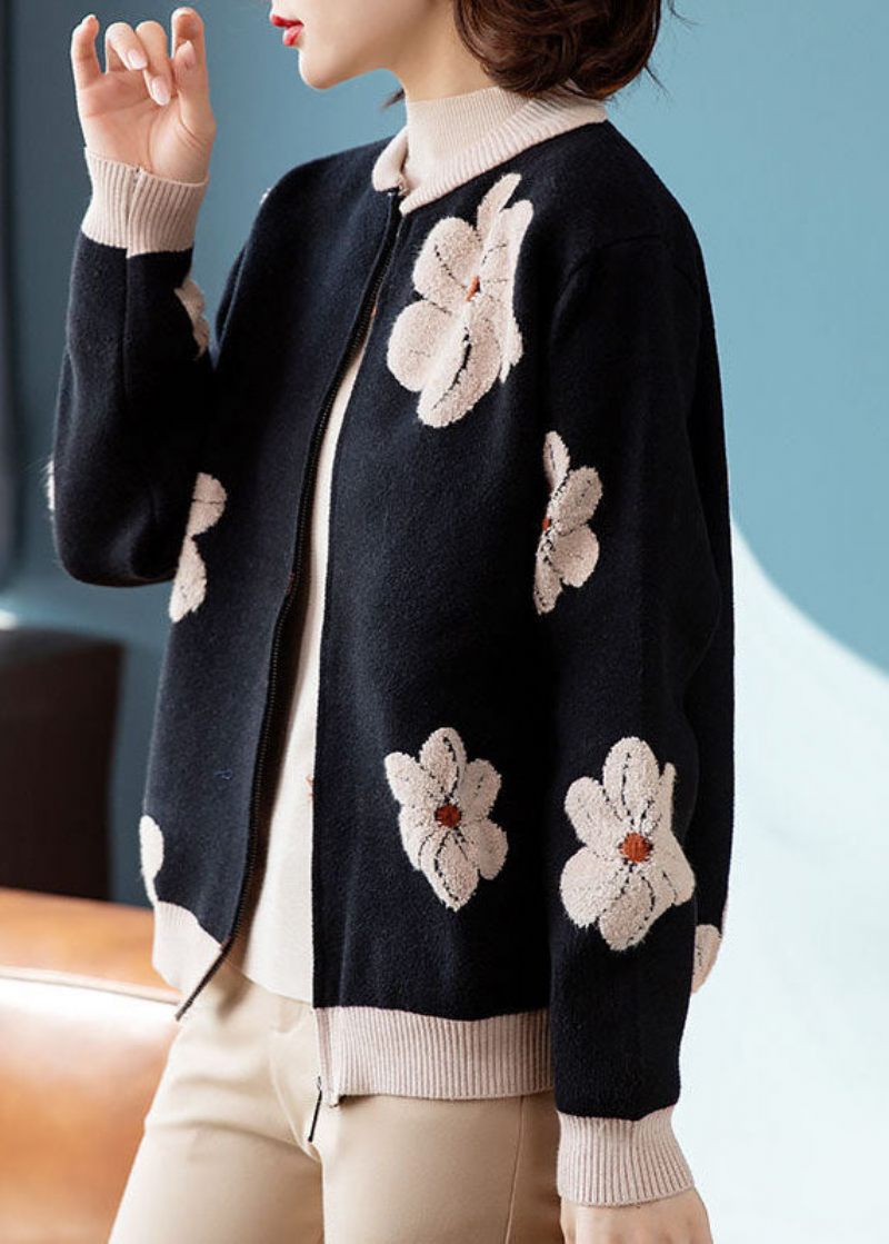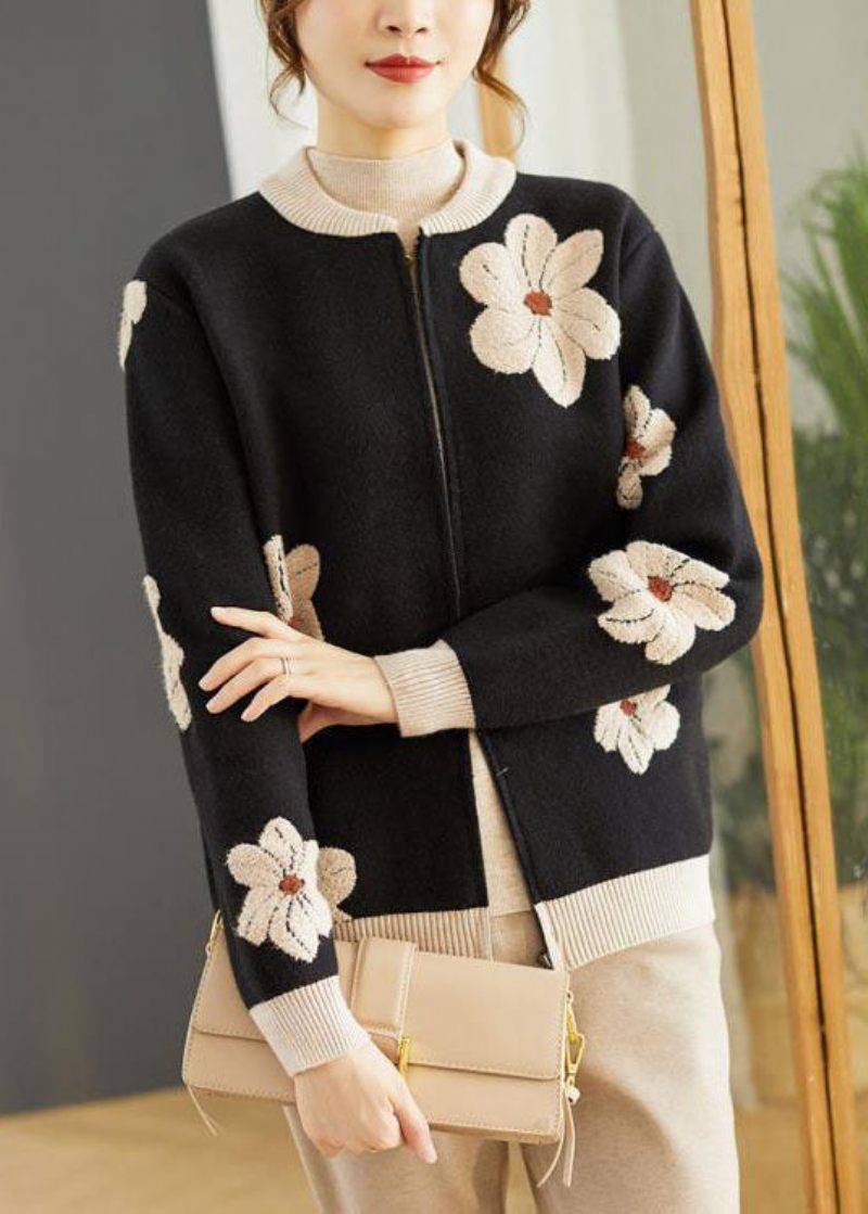 Kvinnor Svart Stativ Krage Broderade Blommiga Yllerockar Långärmad