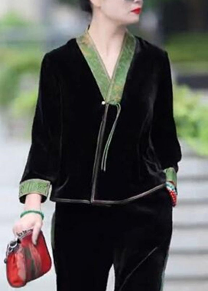 Kvinnor Svart V-halstryck Patchwork Tofs Silk Velour Coat Långärmad