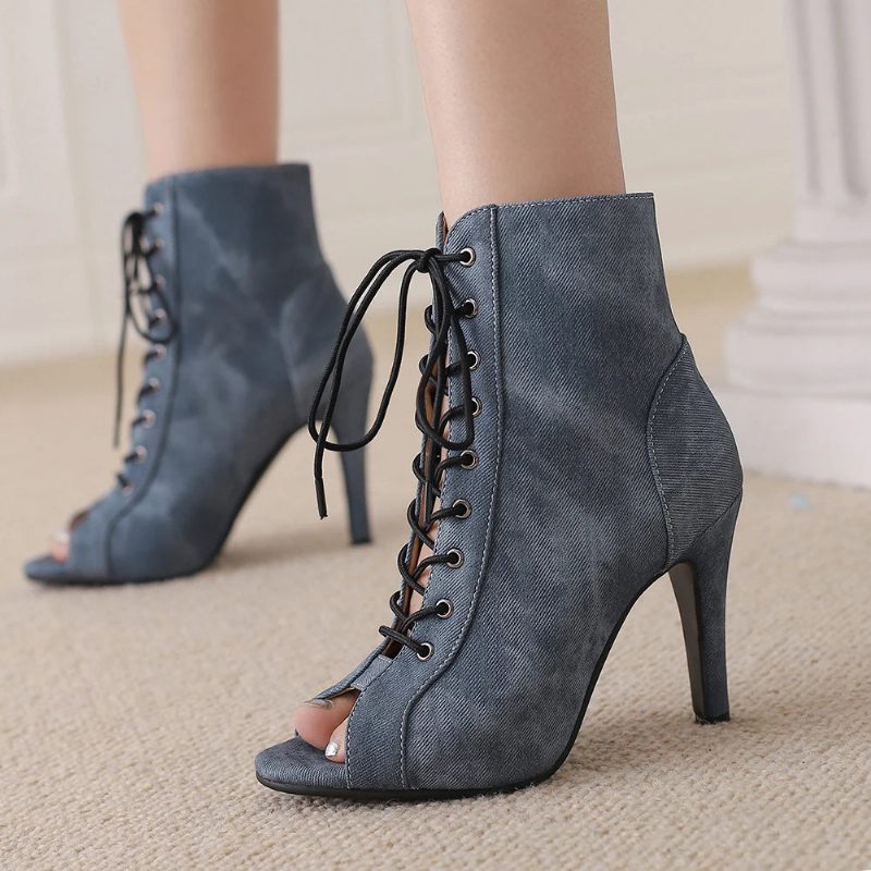 Kvinnors Fest Denim Tyg Stövlar Kvinnor Höga Klackar Skor Kvinna