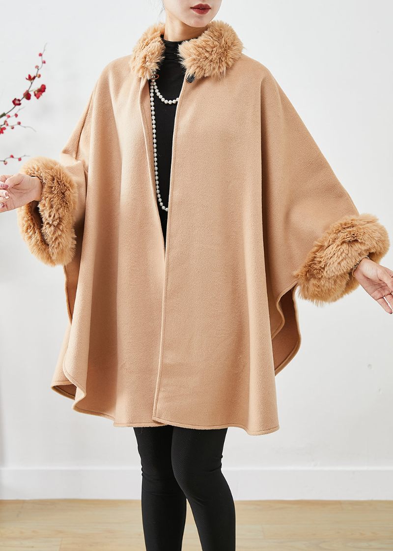 Lätt Camel Woolen Trench Överdimensionerad Pälskrage Batwing Sleeve