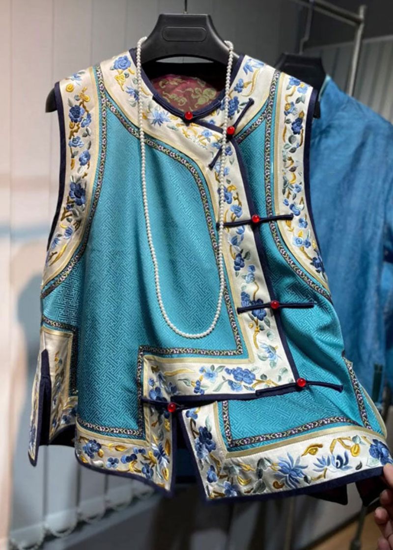 Lös Blå O-hals Broderad Blommig Patchwork Sidenväst Höst