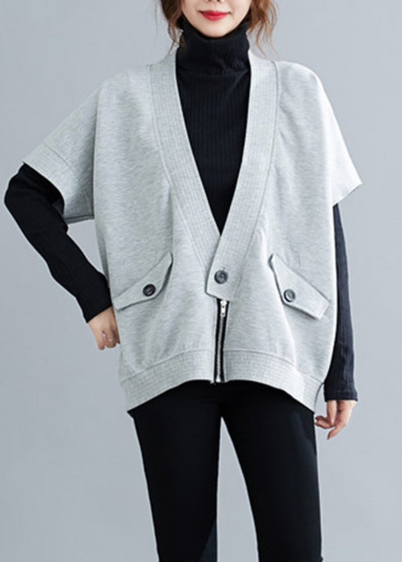 Lös Grå Dragkedja Med Knapp Patchwork Bomullsväst Höst