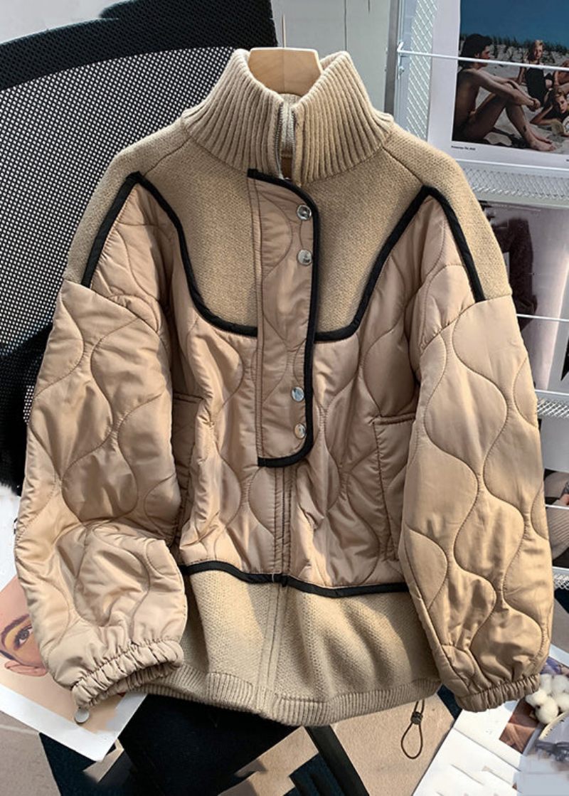 Lös Khaki Zip Up Stickad Patchwork Parka Långärmad