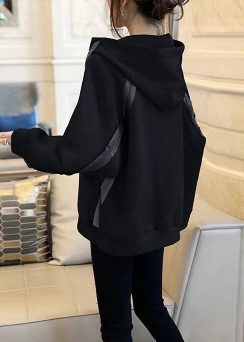 Lös Svart Huva Lace Up Patchwork Bomull Coat Fall