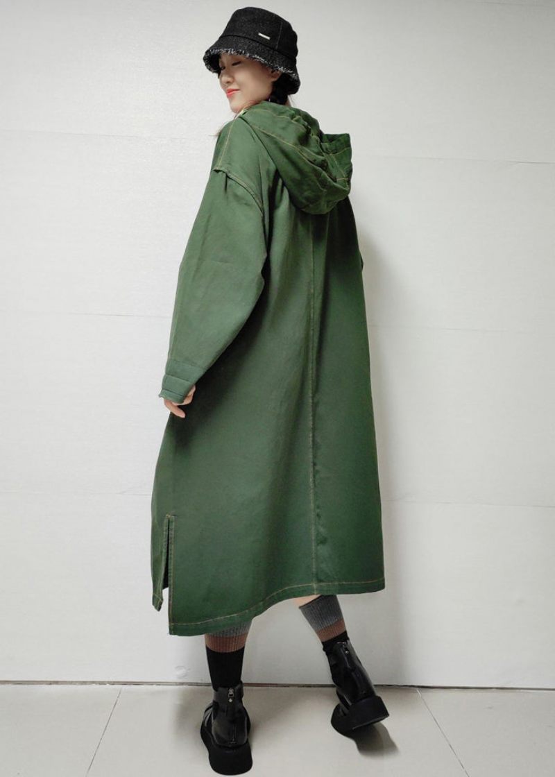 Lösa Armégröna Huvfickor Denim Lång Trenchcoat Höst