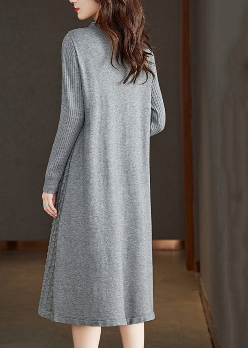 Lösa Grå O-halsfickor Patchwork Ullklänning Höst