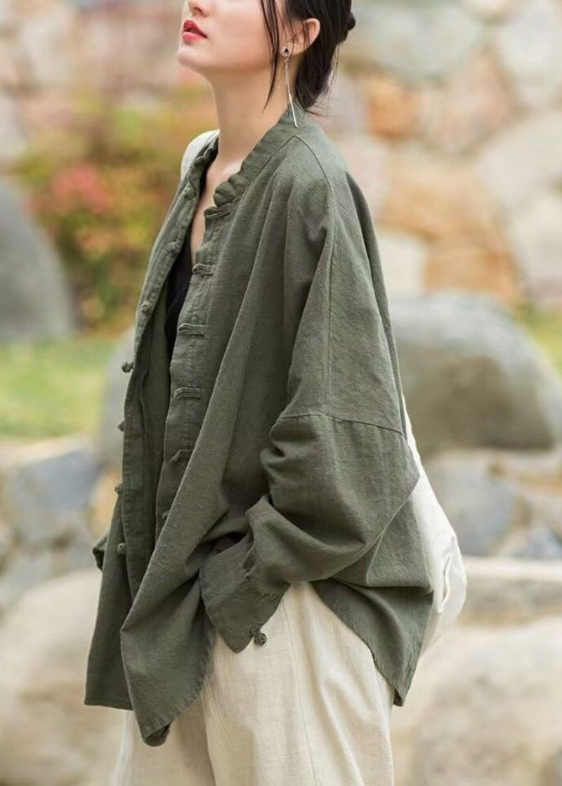 Lösa Gröna Solid Knapp Bomullsrockar Långärmad
