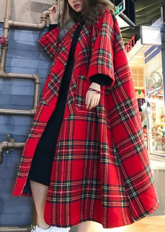 Lösa Röda Hooded Print Fickor Patchwork Bomull Långa Kappor Höst