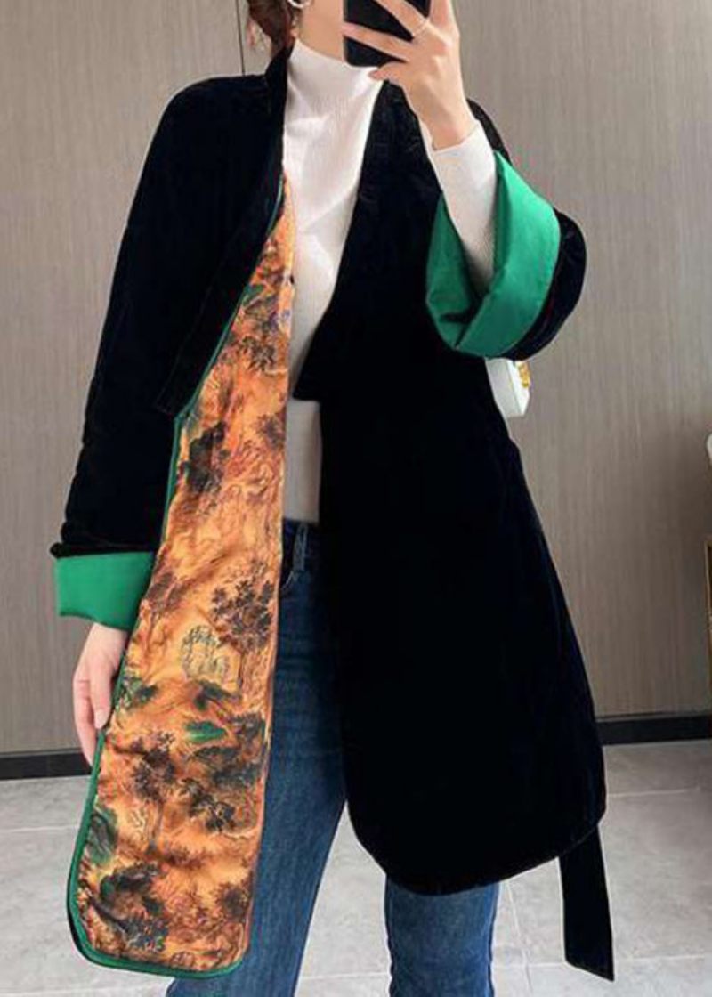 Lösa Svarta Skärp Fickor Patchwork Fin Bomullsfylld Velourkappa Vinter