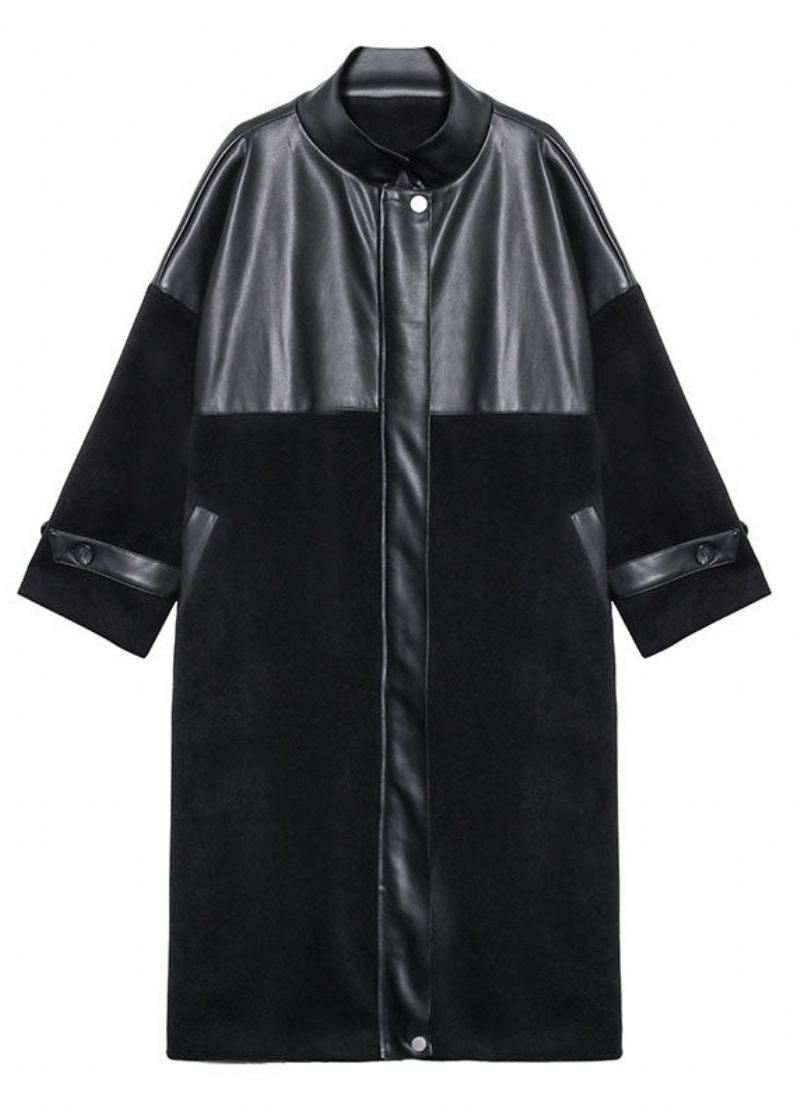 Lyxig Svart Ylle Lapptäcke Pu Dragkedja Vinter Bomull Dam Kappor