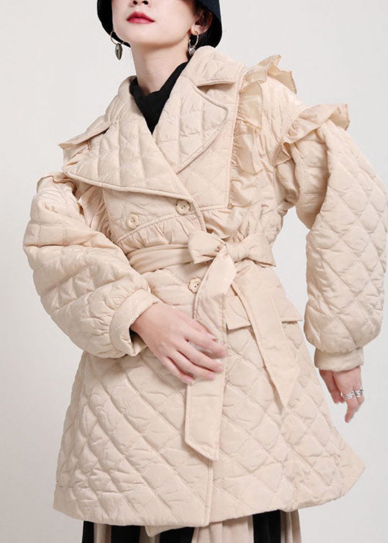Lyxiga Khaki Pockets Knapp Volang Med Knytband I Midjan Vinter Bomullsparkas Långärmad