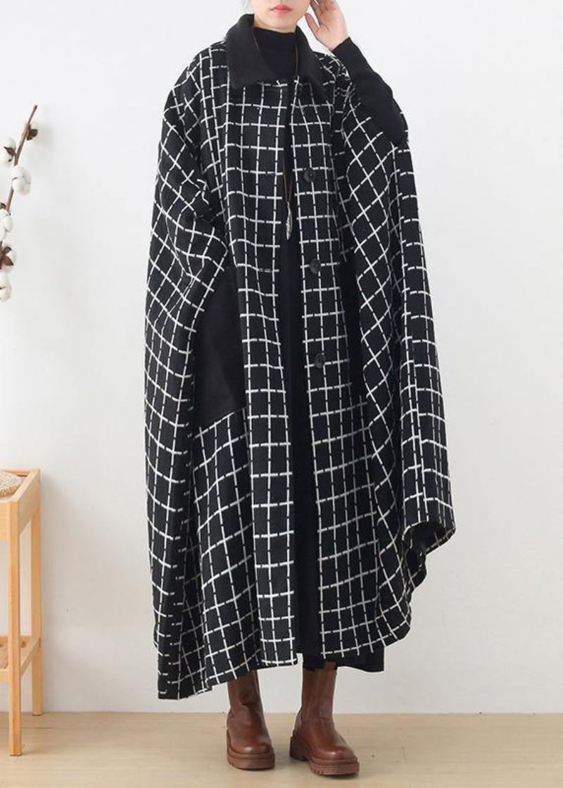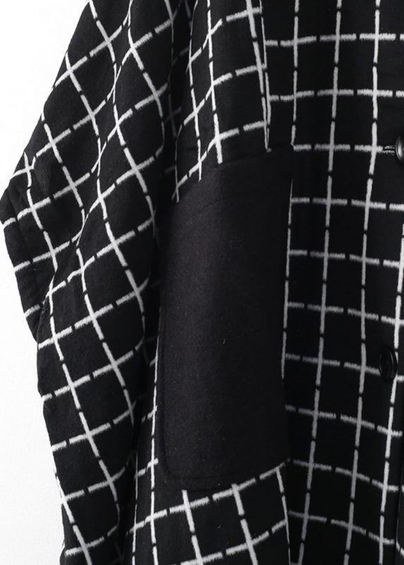 Mode Casual Maxi Kappa Ytterkläder Svart Vit Rutig Lapel Fickor Yllerockar