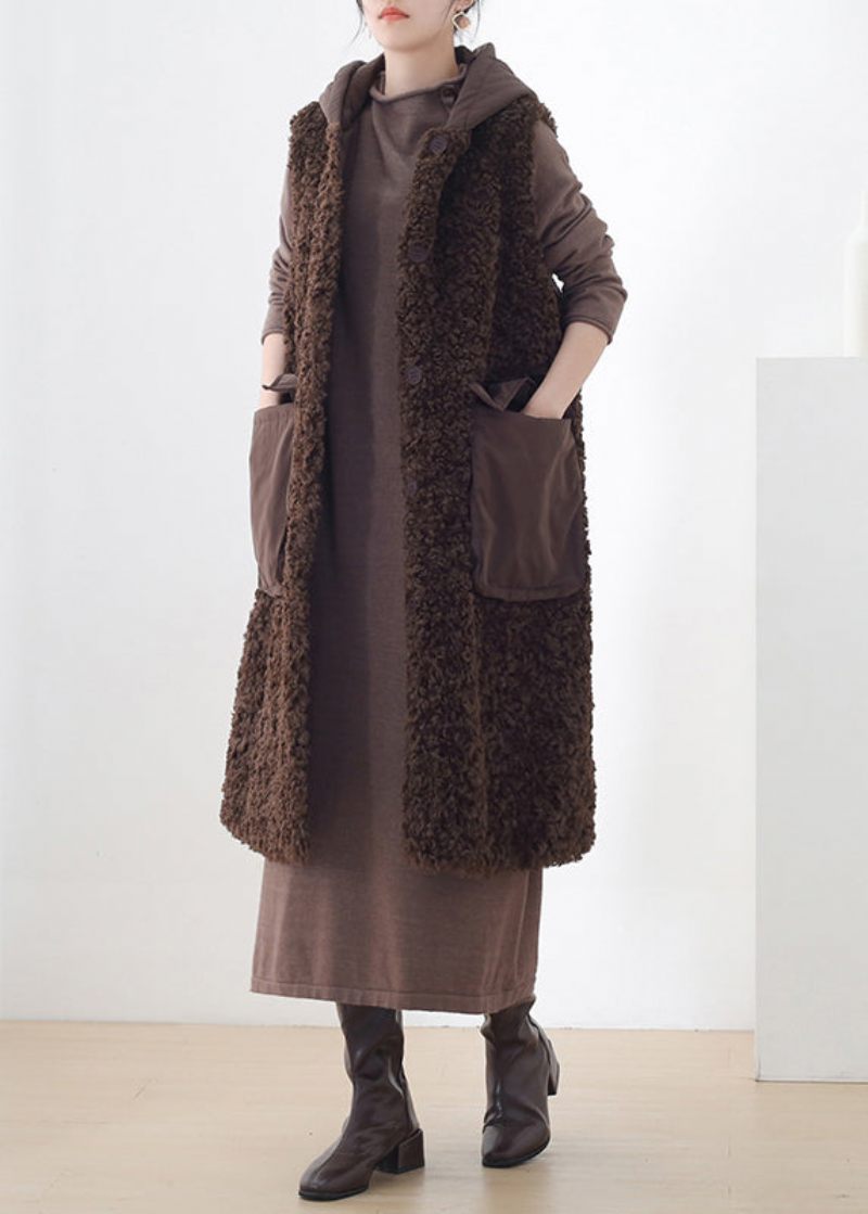 Mode Choklad Färg Knapp Ylle Huva Väst Ärmlös
