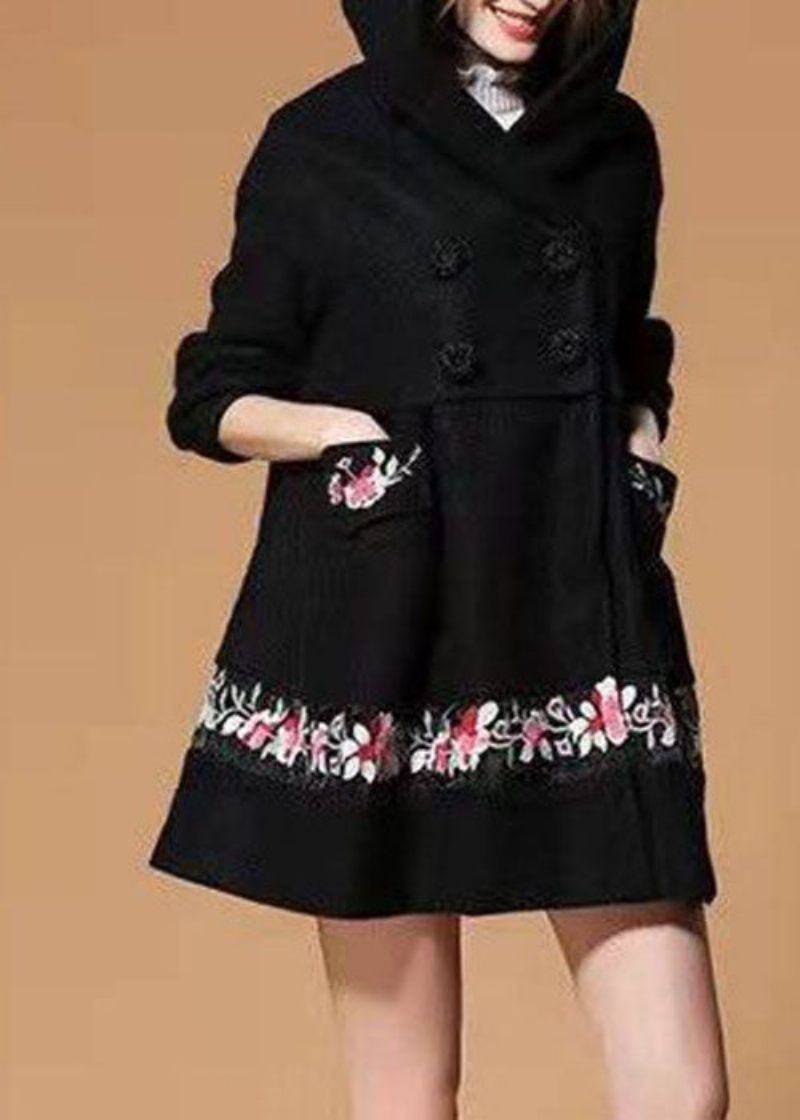 Mode Svart Huva Broderad Ylle Vinterkappa