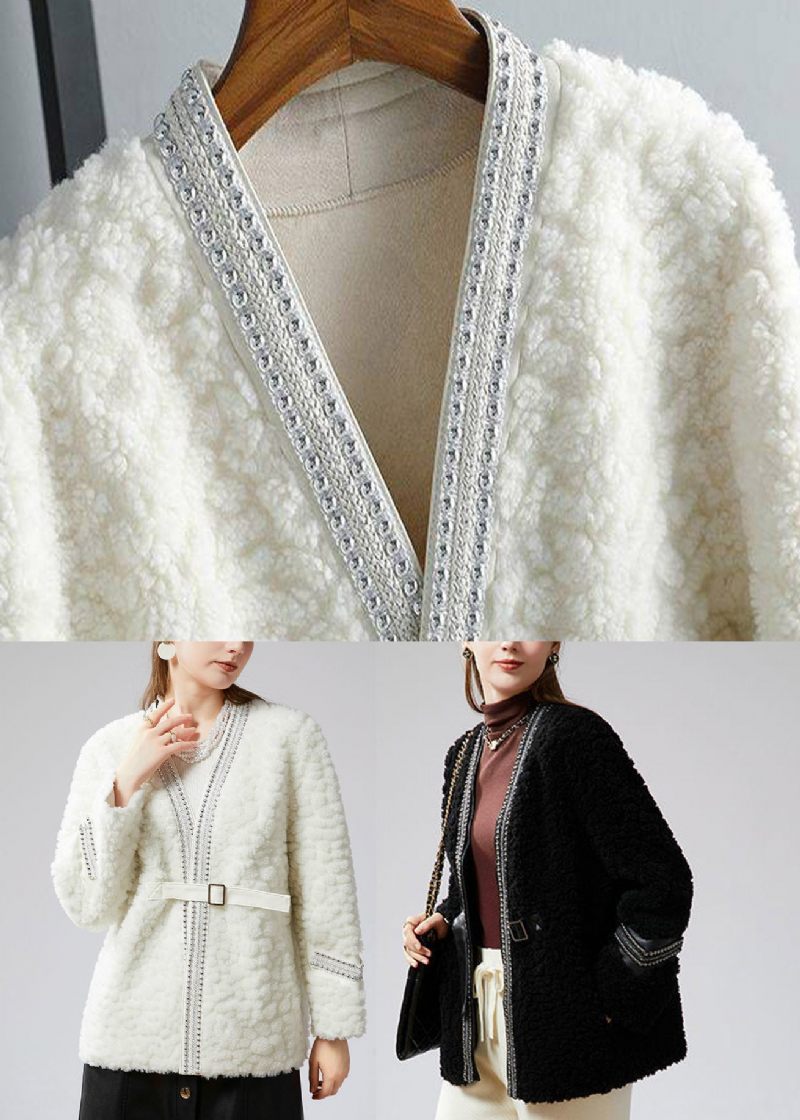 Mode Svart V-hals Patchwork Sashes Faux Fur Coat Vinter
