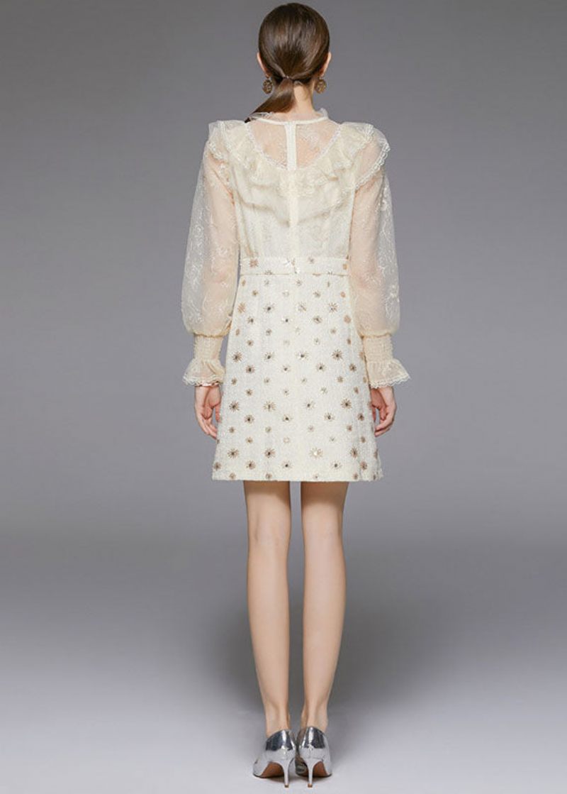 Modern Beige O-neck Volanger Patchwork Tyll Ylle Mid Dress Fall