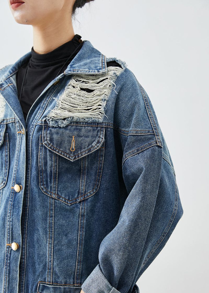 Modern Blå Överdimensionerad Denim Sliten Kappa Ytterkläder Höst