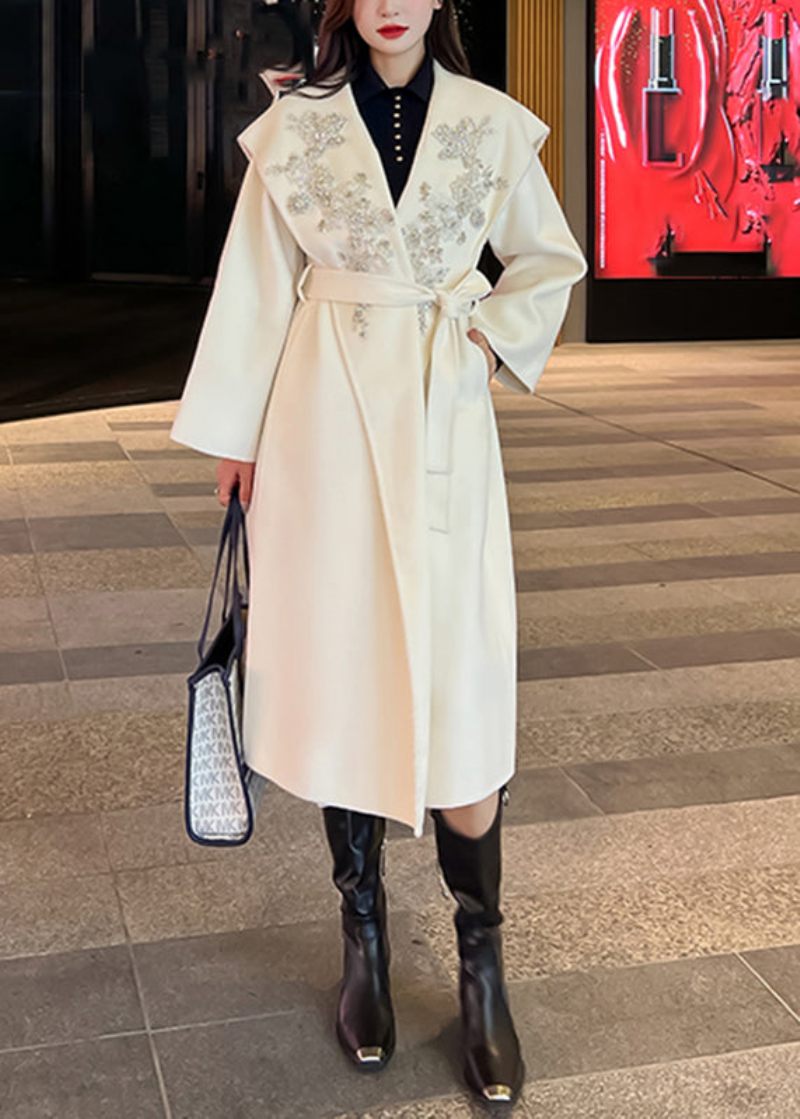 Modern Svart Broderad Slips Midja Ylle Trenchcoat Långärmad