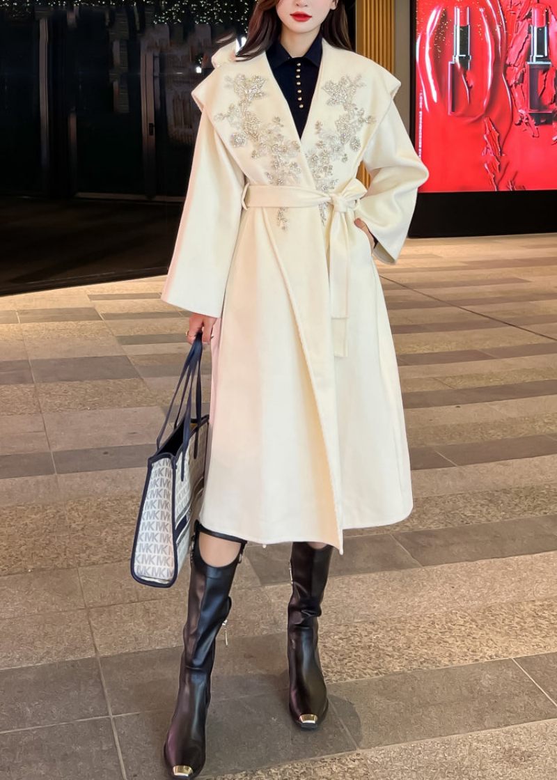 Modern Svart Broderad Slips Midja Ylle Trenchcoat Långärmad