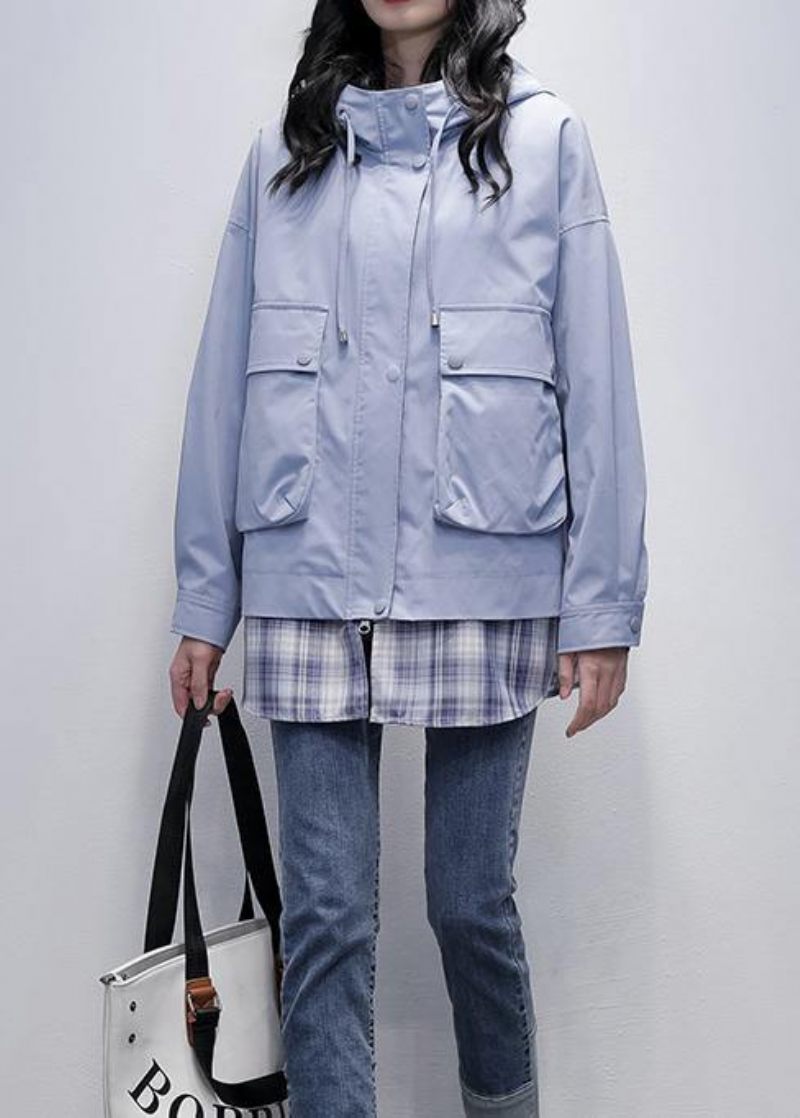 Naturlig Grå Blå Patchwork Pläd Fin Trenchcoat Skjortor Huvfickor Ytterkläder