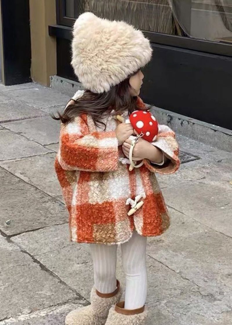 Ny Rutig Hooded Button Woolen Girl Coat Långärmad