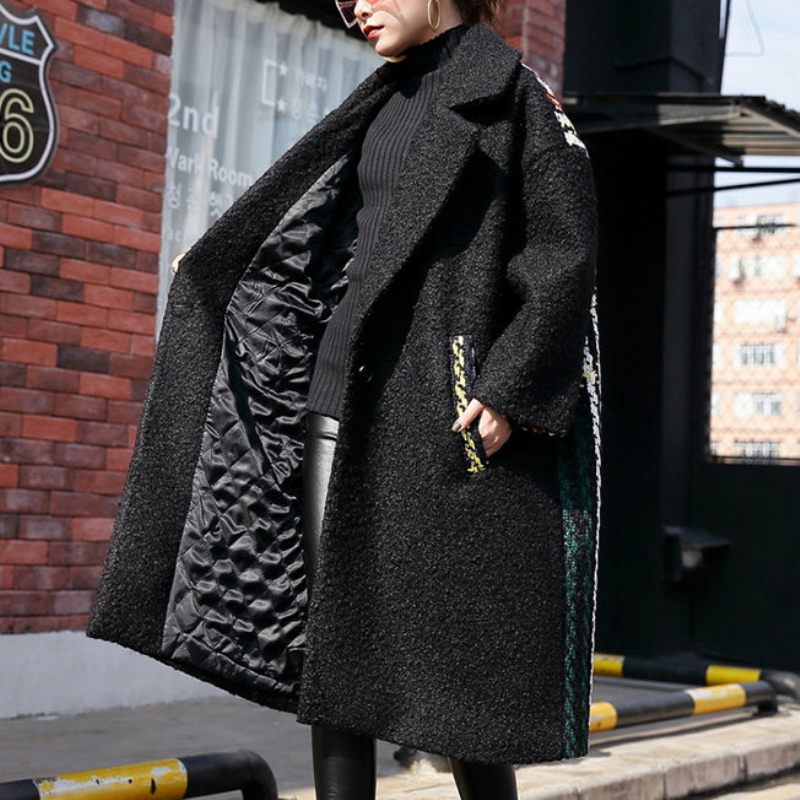 Ny Svart Vinterkappa Oversized Naggad Baksida Öppen Maxirock Damfickor Lapptäcke Långa Jackor