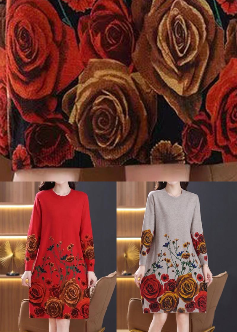 Nya Röda Tryck Sida Öppen Ull Stickade Klänningar Långärmad