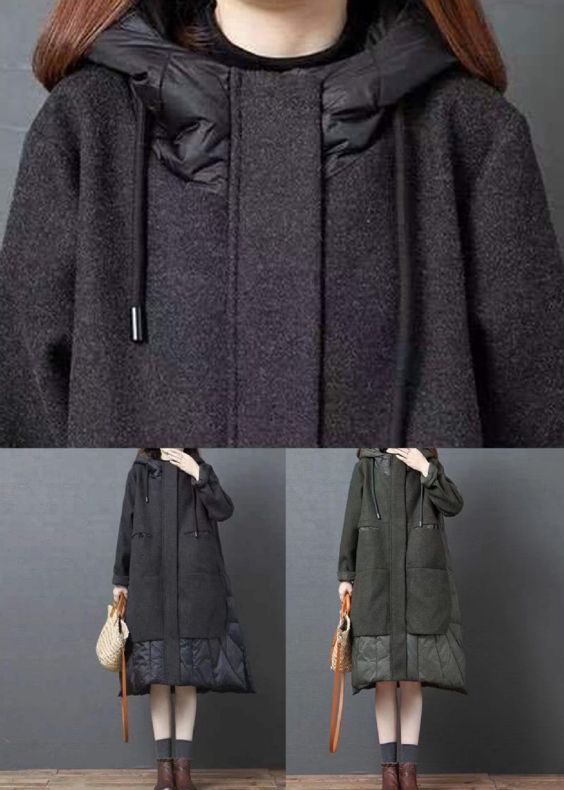 Nya Svarta Huvfickor Patchwork Tjock Ylle Lång Kappa Vinter
